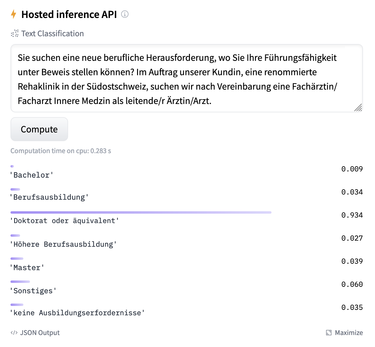 You may use the fine-tuned models in your local machine by following the installation instructions in the code repository. Alternatively, the models (one of "base" size and one of "large") were uploaded to the huggingface hub, so you may try them via the hub's web interface. For example, here are the scores that the "large" model predicts for an excerpt of a job ad looking for a specialist in internal medicine. Remark: the output of the hub's web interface was modified for better readability.